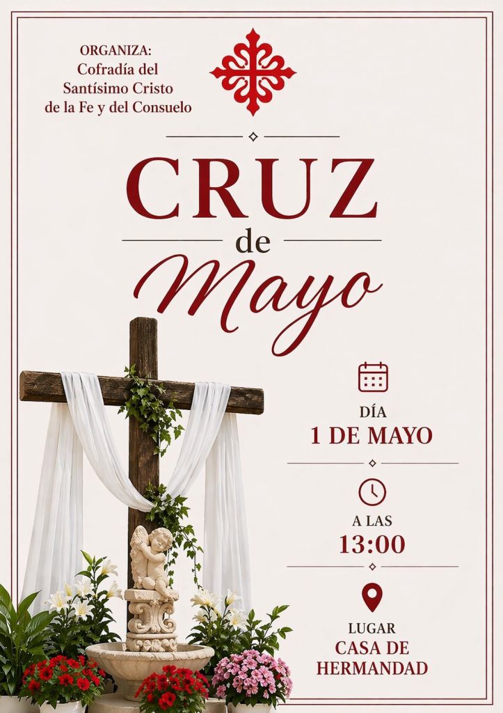 Llega el mes de las flores y, con él, una de las festividades más hermosas y alegres de nuestra tierra. Desde la Cofradía del Santísimo Cristo de la Fe y del Consuelo, nos llena de ilusión invitar a todos los hermanos, devotos y vecinos a la celebración de nuestra tradicional Cruz de Mayo.